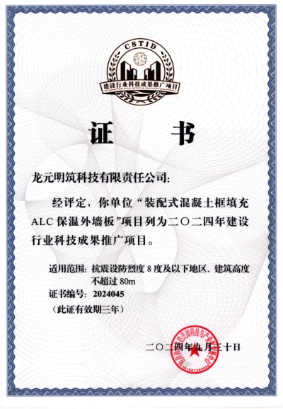 近日,由龍?jiān)瘓F(tuán)生態(tài)成員單位龍?jiān)髦邪l(fā)的“裝配式混凝土框填充ALC保溫外墻板”成功通過住房和城鄉(xiāng)建設(shè)部科技與產(chǎn)業(yè)化發(fā)展中心科技成果評(píng)估,獲評(píng)2024年建設(shè)行業(yè)科技成果推廣項(xiàng)目。 《建設(shè)行業(yè)科技成果推廣項(xiàng)目》是建設(shè)領(lǐng)域的國家推廣項(xiàng)目,對(duì)促進(jìn)科技成果...了解更多>>