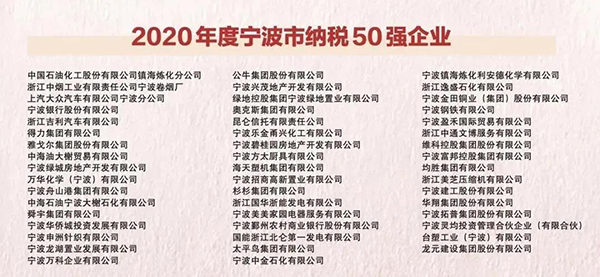 5月19日,寧波市舉行制造業(yè)高質(zhì)量發(fā)展大會暨2020創(chuàng)業(yè)創(chuàng)新風(fēng)云榜頒獎會議。會議揭曉了2020年度寧波市“納稅50強”企業(yè)、寧波市制造業(yè)“納稅50強”企業(yè)、寧波市房地產(chǎn)建筑業(yè)“納稅20強”企業(yè)等榜單。