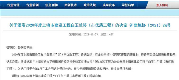 113日,上海市建筑施工行業協會發布《關于頒發2020年度上海市建設工程白玉蘭獎(市優質工程)的決定》,龍元集團承建的老西門中華新城(北地塊)3#樓、4#樓、5#樓榮獲3項“白玉蘭”獎。