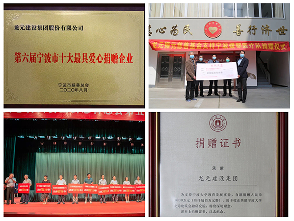 此外,集團還積極參與社會公益活動,主動承擔社會責任,在愛心助學、扶貧幫困、社會捐贈、疫情防控等方面積極捐款捐物。2007年起,集團公司連續15年在象山縣慈善總會建立幫困基金。今年,集團與象山縣慈善總會攜手,繼續設立為期10年的“龍元慈善濟困”冠名基金,積極參與家鄉的經濟社會建設。2020年起,集團向寧波大學捐資打造寧波大學龍元建筑金融研究院,為家鄉建筑業的轉型升級培養人才以及輸出高質量的研究成果。2020年新冠疫情期間捐贈用于援鄂醫療醫護人員,致敬“逆行者”。集團還榮獲第六屆寧波市“十大最具愛心捐贈企業”、第六屆“寧波慈善獎”捐贈企業獎。