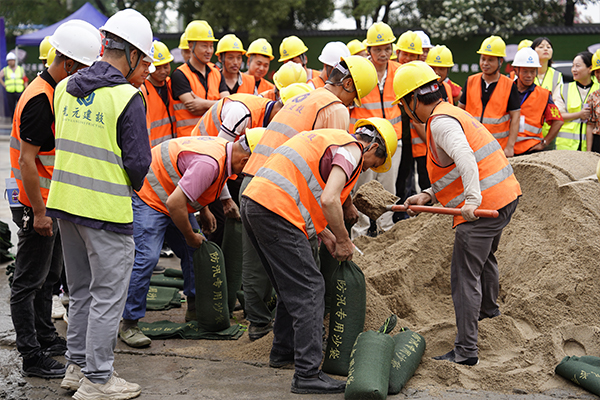 本次應(yīng)急演練活動(dòng)分為防汛排澇應(yīng)急演練比武和消防滅火應(yīng)急演練兩部分。防汛排澇應(yīng)急演練比武內(nèi)容為在兩地塊的車庫坡道口分別堆筑50厘米高度的阻洪堤,利用抽水設(shè)備進(jìn)行排澇,用時(shí)最短的即為優(yōu)勝隊(duì)伍。六支參賽隊(duì)伍齊心協(xié)力,裝沙包、運(yùn)沙包、堆沙包、排澇......現(xiàn)場加油和沖刺聲此起彼伏。
