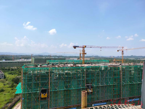 712日上午,在廣信區城南新區的和興家園安置小區項目施工現場,各類大型機械開足馬力,一輛輛大卡車運著材料駛進施工場地,工人們馬不停蹄地搶抓時間節點,高峰期,每天施工人員超500余人。